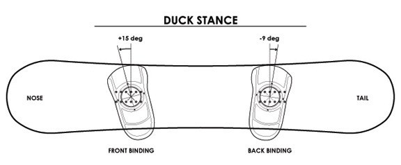 Углы крепления увеличиваются на три градуса. Попробуй отрицательный угол в 3 или 6 градусов для задней ноги. Для большего эффекта, нужно установить отрицательный угол на 15 градусов. Многие райдеры также считают дакфут наиболее комфортной позицией для коленей.